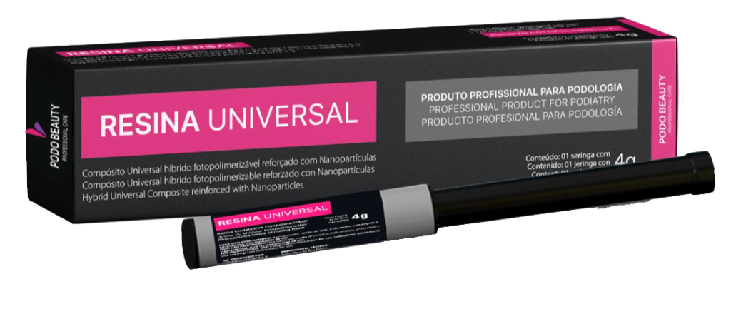 Resina Universal é um compósito híbrido de partículas finas, com alto teor de carga e reforçado com nanopartículas. É um composto radiopaco e fotopolimerizável na lâmina ungueal ou em modelos.