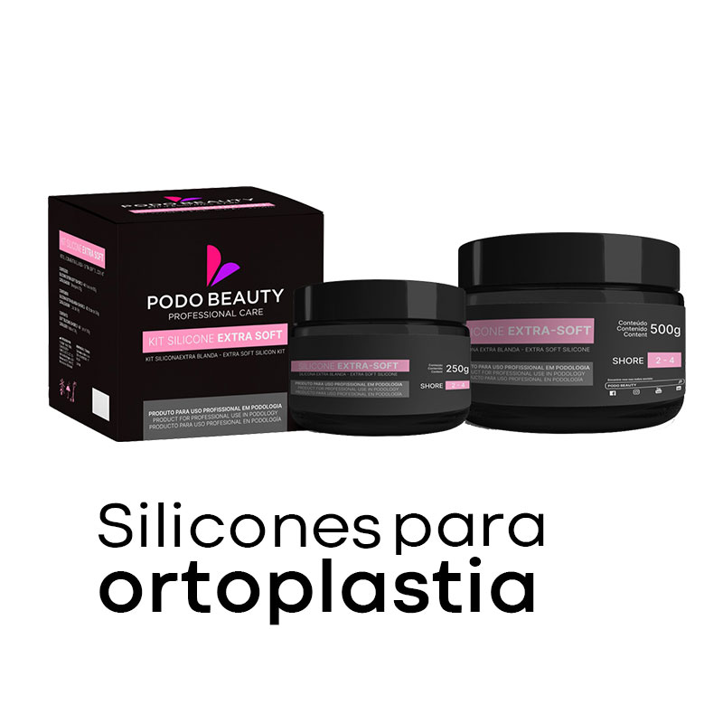 SILICONE PODO BEAUTY é um produto de silicone de condensação indicado para confecção de órteses siliconadas destinadas a práticas podológicas. Possui as apresentações EXTRA SOFT (shore 2-4), SOFT (shore 12 – 15), MEDIUM (shore 25 – 26), com 250g ou 500g, e CATALISADOR PODO BEAUTY PARA SILICONES(Catalisador Universal), com 50g